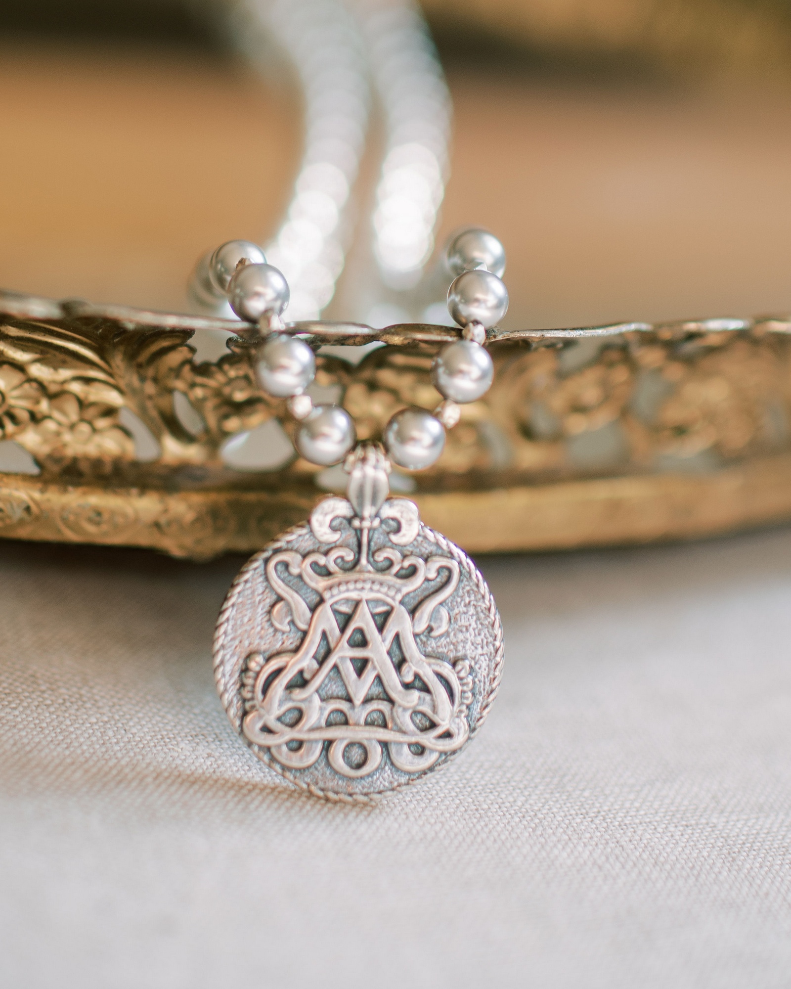 This sterling silver pendant features the Blessed Virgin’s monogram, an intertwining “A” and “M" which stands for Auspice Maria, Latin for “Under the protection of Mary.” The crown on top represents Mary as Queen of Heaven. The Swarovski imitation gray pearls are set between sterling accent beads. The reverse side is the stamp of the medal of the Immaculate Conception also commonly called the “Miraculous Medal” due to the many healings attributed to it. The necklace also features a strong sterling magnetic clasp. Available in 16” and 18” length or longer if desired. “O Mary, conceived without sin, pray for us who have recourse to you.”